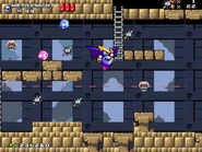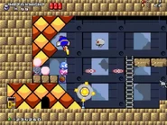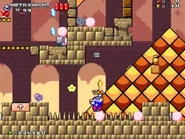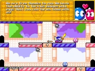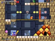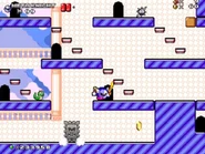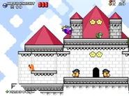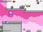 The first room inside the castle has the player start at the bottom, and they must find their way to the top while dealing with various enemies, such as the bouncing balls on the ? blocks known as Chuckies, the undestroyable spikey Gordos, the floating Mumbies and the bat-like Flappers, that stand in their way.