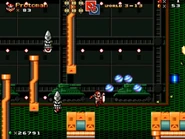 The second area takes place inside the base as the player will battle through exploding robots Bomb Throwns, Cannons control by Metalls and Jet Bombs that explode into four pieces upon content with the wall alongside with the military arsenal of the Rebel Army. At the end, the player battles a Power Muscler that is guarding the gate and defeating it gains a key to unlock the path to the next area.