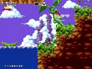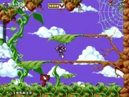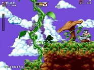 The first main area is a remix of Mickey and the Beanstalk level from Mickey Mania, where the player travels through to a magical beanstalk world with a castle in the clouds now owned by a certain giant in the background. The player can also jump on the giant seeds to grow platforms or springs grow underneath the ground, ride in a leaf boat across the lake and avoid the yellow flowers that spits multiple seeds at the player. At the same time, the player must also fight though giant living bugs and other enemies, such as the return of the Badniks.