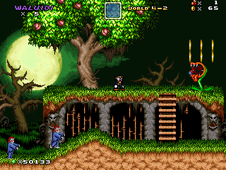 This level takes place in a graveyard century with some forest and hills on the far side on the moon in the center. This is where Sir Arthur started his adventure in the Ghosts 'n Goblins series after Princess Prin-Prin got kidnapped by the demon King Astaroth and his undead army, requiring Arthur to go save her.