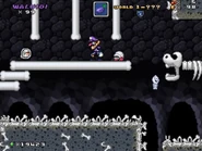 The third area has the player crossing a huge dinosaur skeleton spine bridge while dealing with the Big Boos and avoiding the Lava Bubbles that bounce around the wall in a zigzag pattern before entering another pipe to the center of the cave.