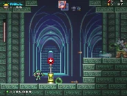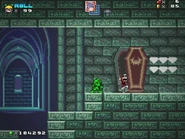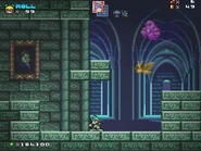 The first area is filled with enemies, most notably Green Balls, Henchmen and Bats from the game Puggsy. There are also friendly purple ghosts that acts like springs for the player to bounce on and function more as allies rather than enemies. A fire rod appears throughout this level just in case the player doesn't have a projectile-based powerup. The player then reaches the door of a castle but when they enter, they are sent into the ruins. From there, the player will encounter enemies coming out of coffins, such as Skeletons from Castlevania and Ground Skeletons from Black Tiger, as well as light blue ghosts that randomly pop out of nowhere and float in the air. The player will have to make use of a fire rod along their way.