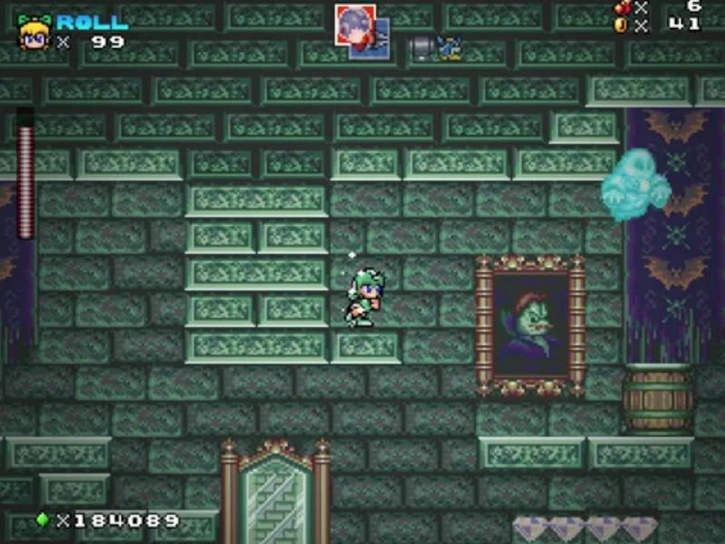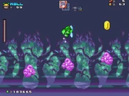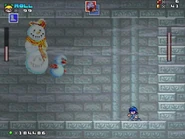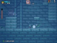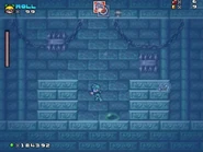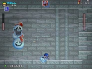 Afterwards, the player then reaches another door that takes them to the deeper part of the ruins with a checkpoint next to two barrels containing powerups. This section is mostly underwater, and contains several more obstacles and enemies, including Moon Tribes, Fishbones, low-hanging Ball-N-Chains, slow moving spike traps and Boos. After passing through this section, the player finds a purple ghost which sends them to a room which contains two Fire Flowers. In the next room, the player confronts the boss that has taken over the castle, who turns out to be the Ghost Snowman, a boss originally found in the 1990 Sega Genesis/Mega Drive, Ghostbusters (based on the popular 1980s film series).