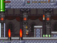 The third area has little to no floor and is mostly covered in lava, meaning that the player needs to use the Donut Blocks and ropes to cross through while avoiding more fire-based enemies, such as Fire Snakes, Fire Bros, Fire Chomps, and Blarggs. After getting past all of that, the player enters a pipe that launches them up into the castle rooftop above.