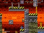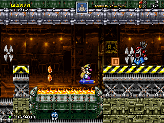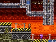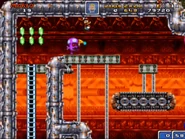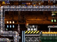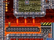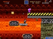 The level starts off with the player making their way towards the right, dealing with various foes, conveyor belts moving every which-way and open pits of acid. After that, there is a free Hammer Bros. Suit and the player will have to use a small spaceship to navigate through a swarm of enemies while avoiding contact with open pits of molten metal. Once overcoming these obstacles, the player will get another checkpoint before entering the last section of the factory, where they will have to deal with open flames and many more threats until finally reaching the level's flagpole.