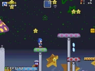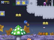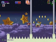 • The first section is a simple platform location, in which the player also needs to jump on mushroom platforms in order to get to the second section. There are also angry-looking stars to watch out for.