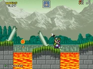 Act 2 is a bit more challenging as the player has to deal with more hazards, such as evading beds of spikes, jumping over the lava and avoiding Podoboos, and pillars that rise up and down, crushing the player if they are standing on them below a ceiling or are beneath them on the ground.