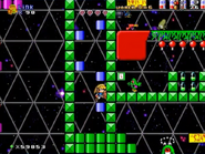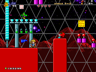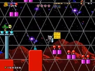 The last area takes inside of a domain where they can see the red mountains in the background. They will have to explore and find the 4 color key cards around the area to go through the doors while dealing with the enemies. At the end, the player gets to the flagpole to clear the level.