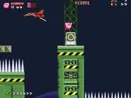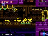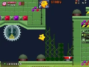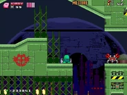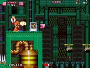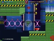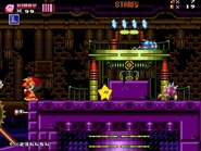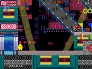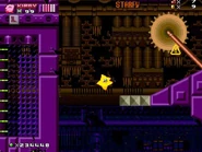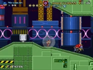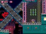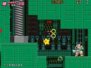 The second area is based on Metropolis Zone from Sonic 2 as it takes place inside of the mechanical facility, being full of flashing lights and mechanical gears in the background. The main gimmick of this area is the Metal Nuts, which are metallic nuts on screws that can be used like a elevator to reach a higher or lower ground. The player will also have to be careful as some of the areas feature Starfish-like Badniks called Asterons, which will slowly chase the player around before self-destructing, causing the spikes around their body to spread around and can hurt the player if any of the spikes hit them. The player will also battle though more Badniks, such as Crabmeats, Robot Mantises, and Egg Pawns. At the end of this area, the player will go down to the bottom to the next area.