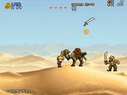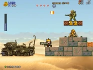 The first part has the player romping through the desert fighting the Rebel army and their allies, such as Arabian-dressed Metal Slug soldiers and some large military vehicles. Along the way, the player will rescue some POWs, meet with some friendly camels, and view some ancient ruin artifacts left behind along the way.