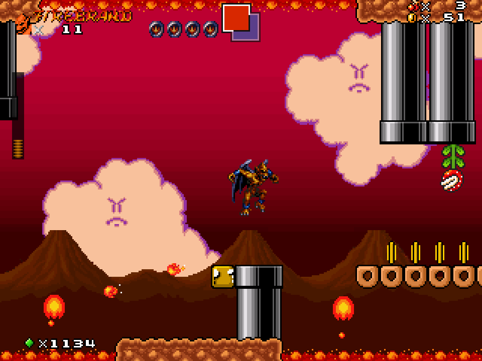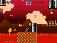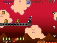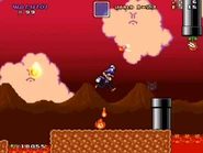 The first area has the player jump over the lava and gray pipe while avoiding the Podoboos and Venus Fire Trap shooting fireballs at them. After passing that, they fight a lot of strong, fire-themed enemies along the way, such as Fire Snakes, Sumo Bros, Blarggs, and Fire Chomps.
