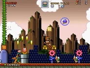 After saving Central City from Dr. Eggman's Badnik Army and Metal Sonic, the player returns to Little Planet but notices the landscape has become a combination of the Mushroom Kingdom's various grasslands and the palm tree-lined beaches of Little Planet, corrupted and poisoned to the point of no return. A variety of Badniks and members of Bowser's Koopa Troop have assaulted the player here, and to make things even worse, the level is plagued by a gradual rain of deadly toxic spores, which slowly float down from above. Some of the spores sprout into Nipper Plants while others sprout into deadly Poison Mushrooms that litter the landscape.