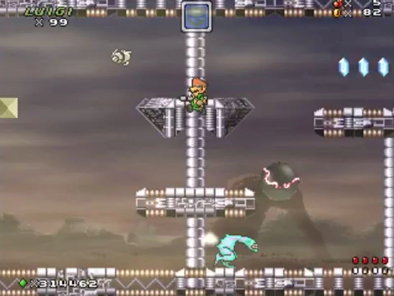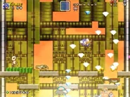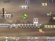 After reaching the second checkpoint, the player will be pursued by an indestructible lightning orb (which behaves like SMB3's Angry Sun) while maneuvering over disappearing platforms, avoiding spikes and enemy attacks.